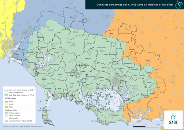 Une cohérence doit également être assurée avec les SAGE limitrophes (Vilaine, Blavet), pour les enjeux communs (qualité des eaux littorales, sécurisation de l'alimentation en eau potable…), et, également, vis-à-vis des communes et structures intercommunales situées à cheval sur plusieurs SAGE.
